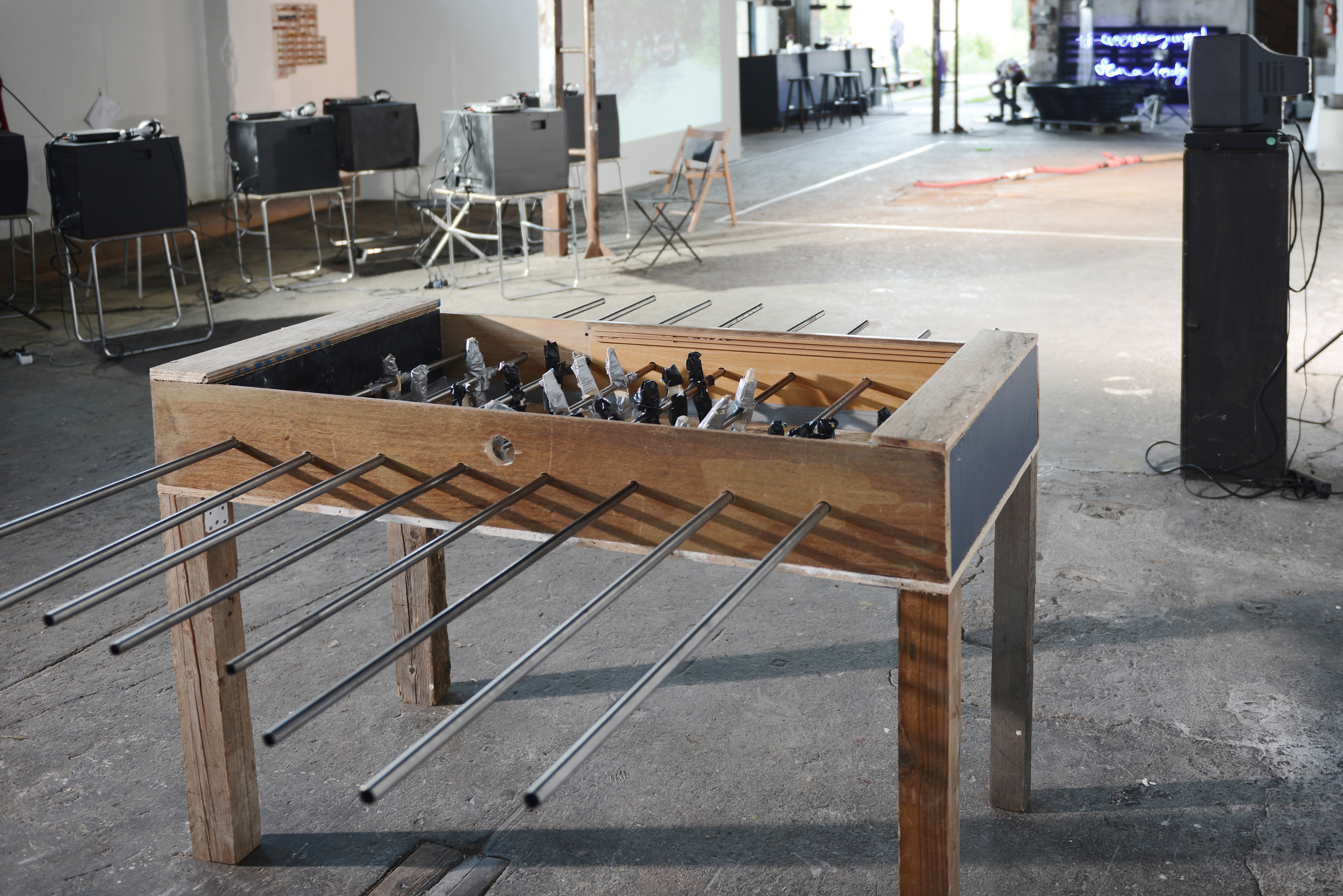 The artist was inspired for the creation of this object by a man with a roma origin from a small village on the bulgarian-turkish border. His name is Angel. He built for his grandchildren a small feriss wheel and a football table. Kamen Stoyanov went to visit him and to learn how to built such a table from a garbage. He filmed on video his plaing grandchildren and the other kids around. Kamen Stoyanov built his table in a more minimal way as it purpose is to be shown in exhibitions. In the popular game the movements of the human body are going trought the static figurs to the ball. The figurs in the Stoyanovs object can be seen as a methapor for the audiance - active as well as passive.