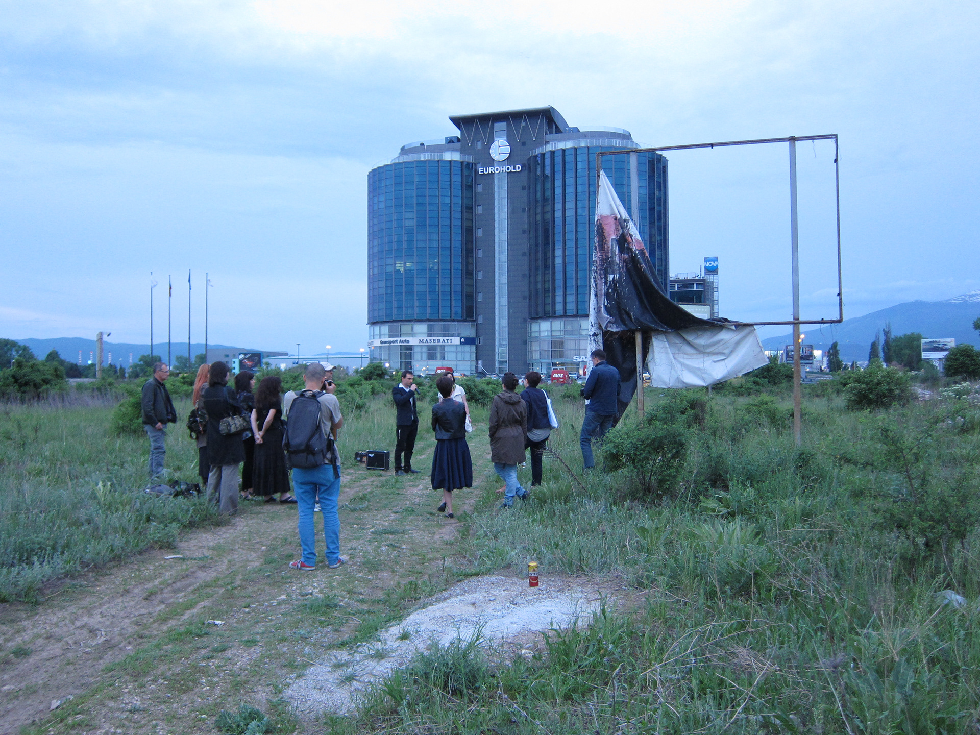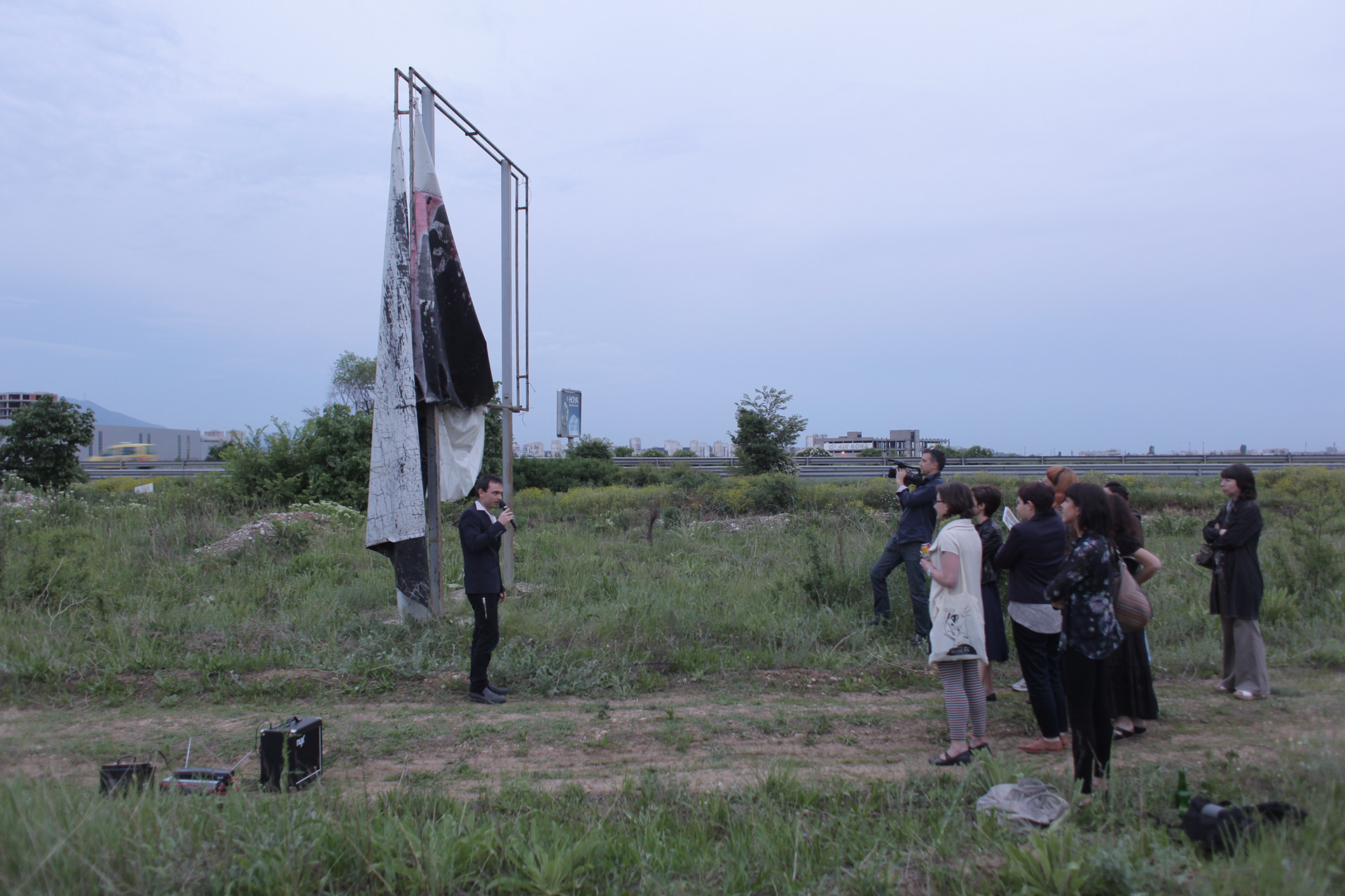 Stoyanov discovered an unused and partially destroyed billboard in a wasteland near Sofia airport. The approximately 3x4m billboard was painted over with black paint in the original position by the artist on site as far as possible. The material moved due to the wind and therefore formed a living surface in contrast to the still canvas in the studio. The artist had to react physically to these cir-cumstances and created a kind of „minimal post-plein-air actionism“. A sculptural work of art was also created here: the volume of the hanging (artificial) fabric was emphasized by the monochrome and the dark colour. After completing the overpainting, the artist opens the new work of art in the second phase of the project - New Piece of Art. Now dressed in an elegant suit, he gives a speech in the style of institutional critic. The black vinyl relicte-poster is being hung up in the exhibition space and the action is projected onto the back.