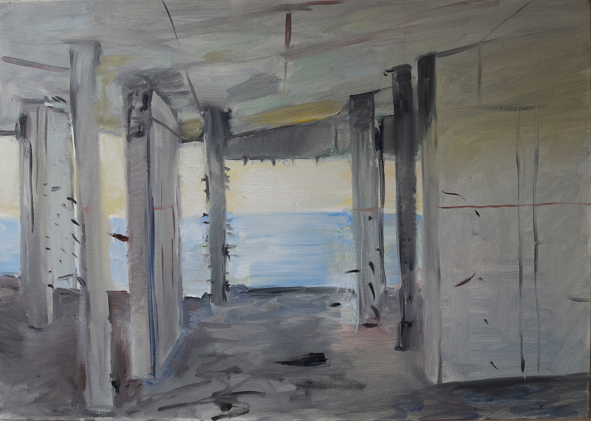 The work Painting Action at Hotel 1000 Columns consists of two elements-a painting and a photography. They are traces of an action, an artistic intervention in a modern hotel ruin. The painting is done on the place and showing the view from there. A try for escape. The photography shows the whole set. One can see the canvas hanging on the concrete wall and the first color and brush traces. The hand of the artist with thebrush is entering the image from the left side.