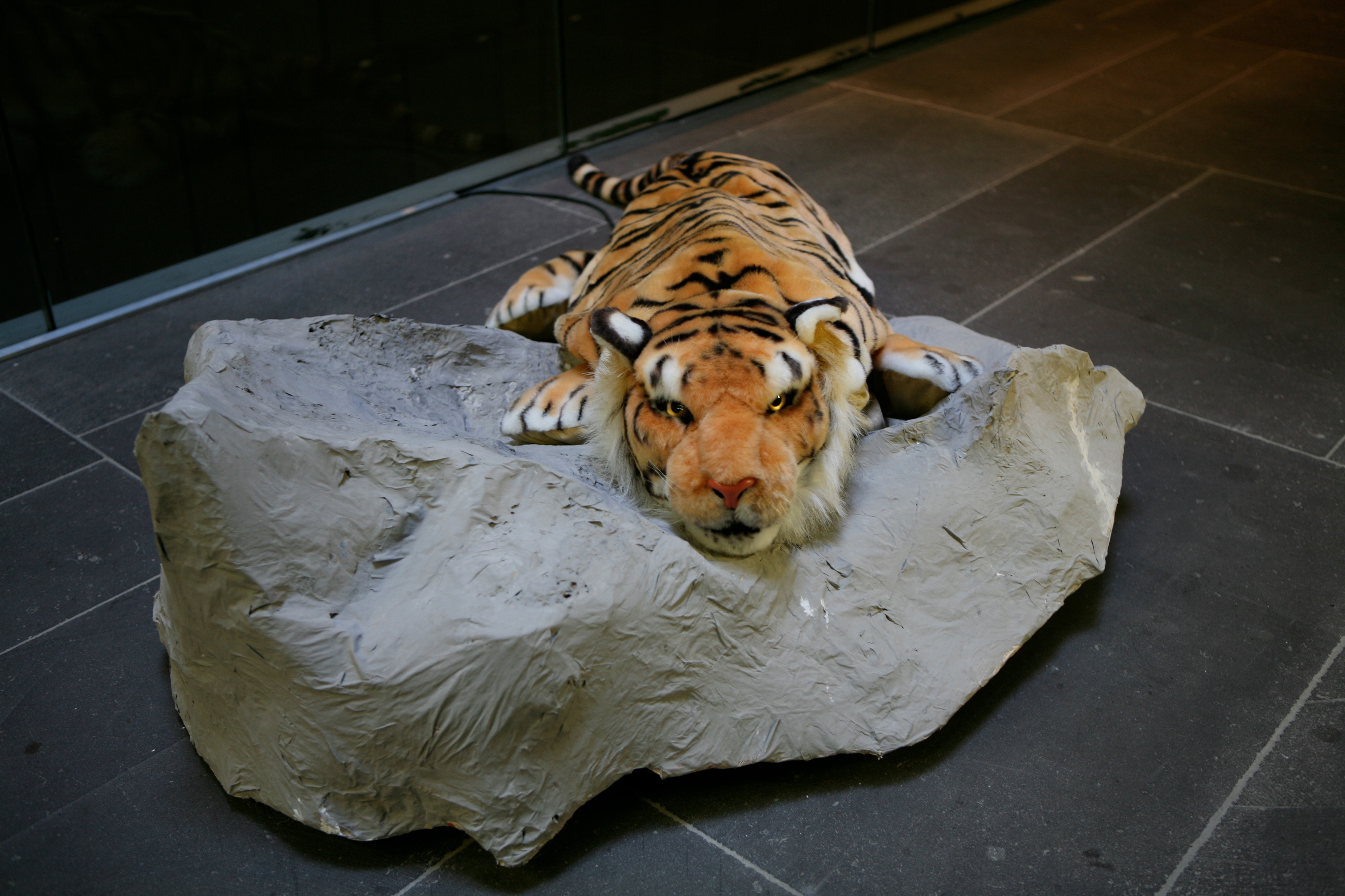 This project deals with the cafeteria and pastry shop Tiger Steps in the TZUM (Central Department Store) in Sofia. TZUM was the most exclusive shopping mall in Sofia. It is situated in the very center of the Bulgarian capital. It has already been known as a so-called shopping paradise during socia-list times. Even Sundays, one could buy goods here which cannot be found elsewhere. After its pri-vatization the new owners of the mall built a new cafeteria and pastry shop that displays a real tiger in a cage of glass. The female tiger named Schakti has spent already four months of its life in here. In the installation a tiger-doll tells this curious story in an ironic way from the tigers point of view. Objects and photographs are proof to the truthfulness of the story.