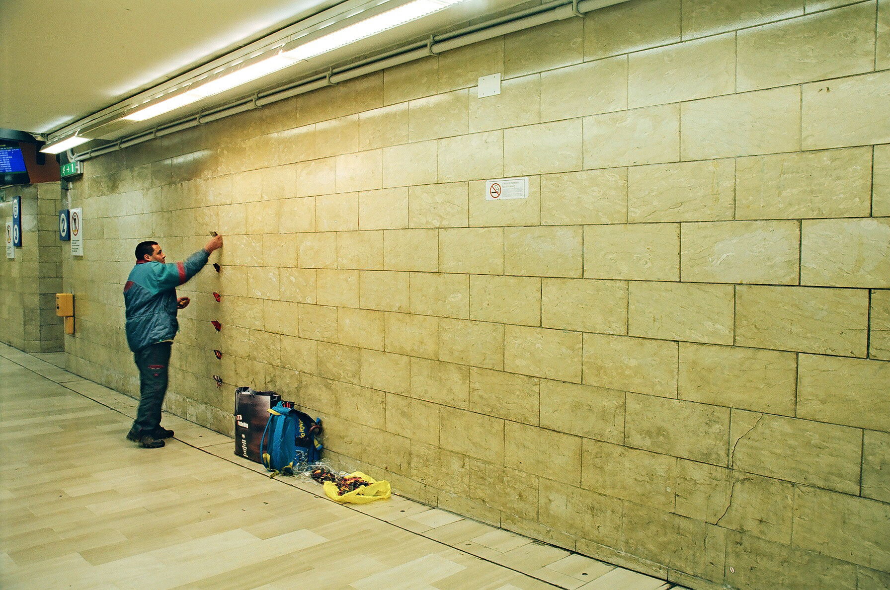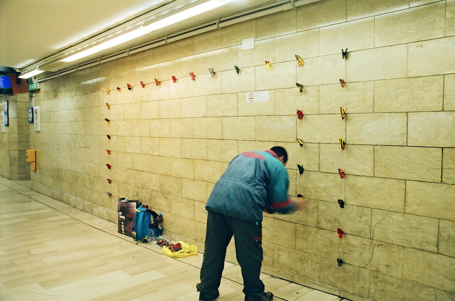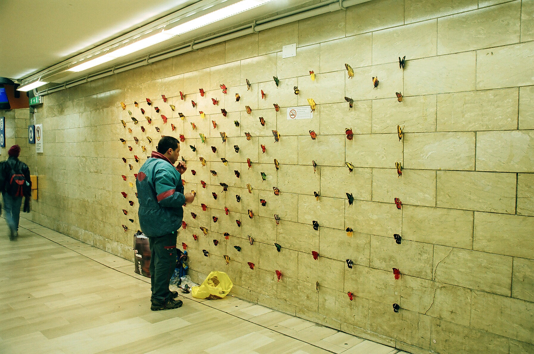 In his slide projection and video work Underground butterflies, Stoyanov documents a man selling artificial butterflies in a subway passage in Rome. The slides follow the order in which the man puts piece by piece on the wall until he finally produces a rectangular pattern of meticulously ordered objects. Here, it is the photographic sequence which is turned into a proto-filmic scenario to articulate what can only be perceived over a longer period of time.